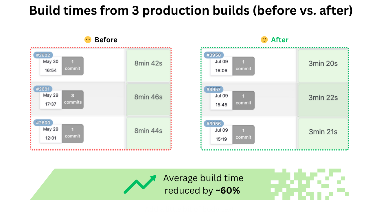 Customer Impact: Delays in fixing bugs due to slow build times were affecting customers. This led to frustration and a decrease in user satisfaction, as customers had to wait longer for improvements/fixes.